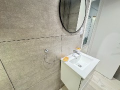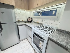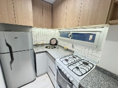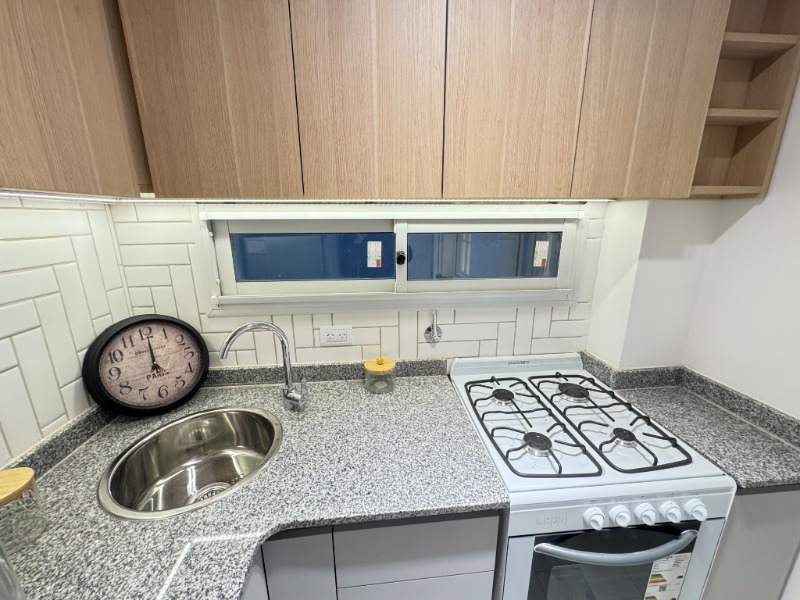 Cocina semi integrada con revestimientos en porcelanato, amueblamientos a medida y ventilación natural