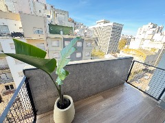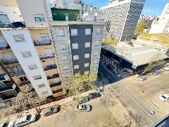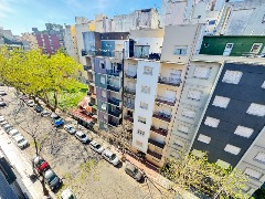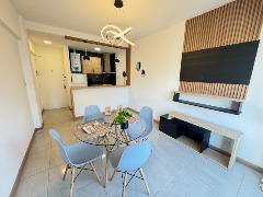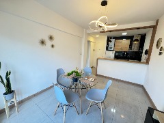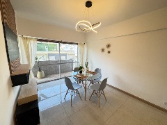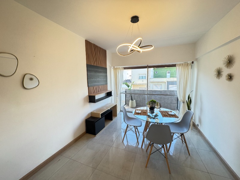 Living comedor con piso de porcelanato, calefactor tiro balanceado, balcón saliente y persiana eléctrica