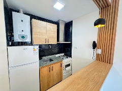 Cocina integrada con revestimientos en porcelanato, amueblamientos a medida y barra desayunadora