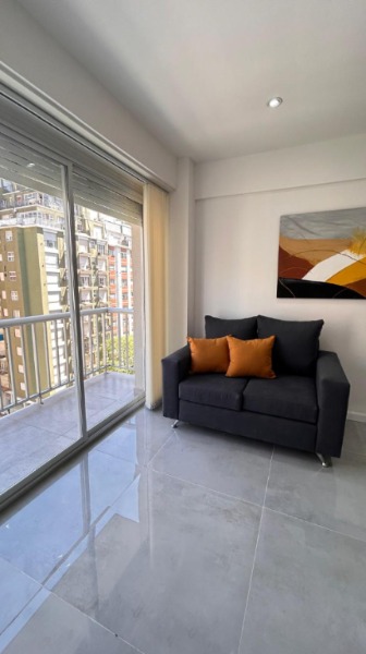 - Living comedor con piso de porcelanato, calefactor tiro balanceado y balcón saliente