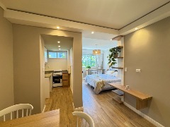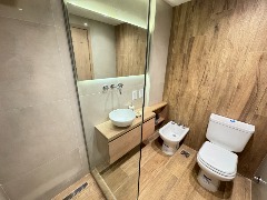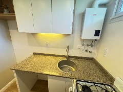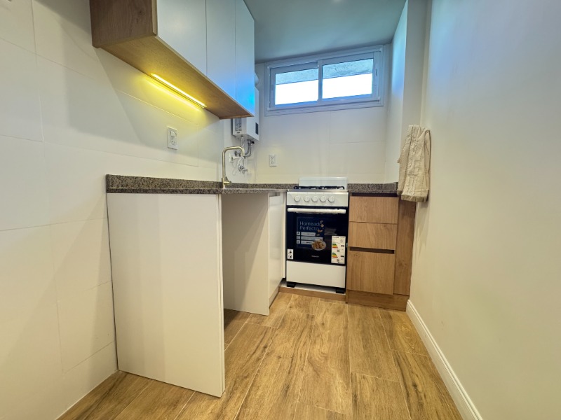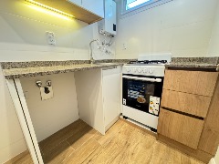 Cocina semi integrada con revestimientos en porcelanato, amueblamientos a medida y conexión para lavarropas automatico