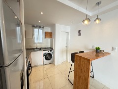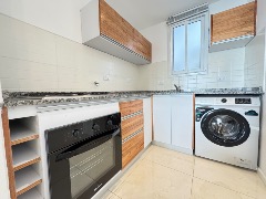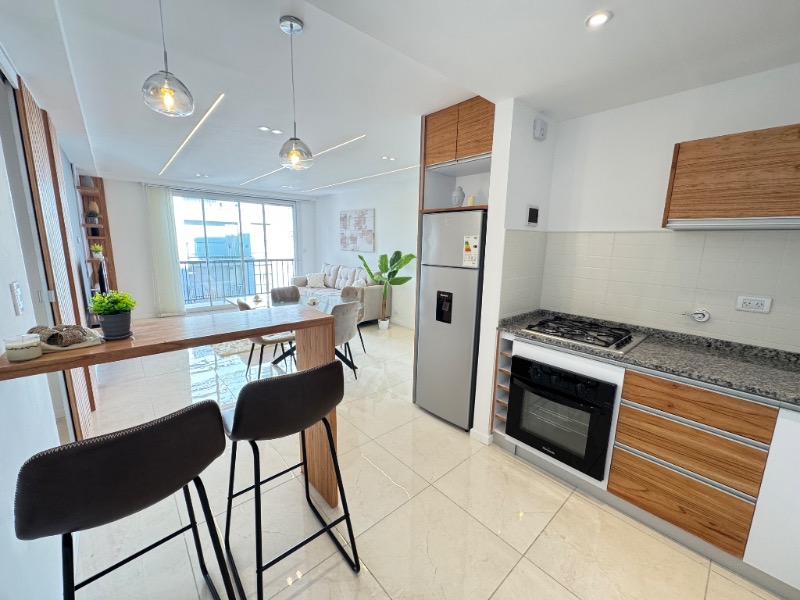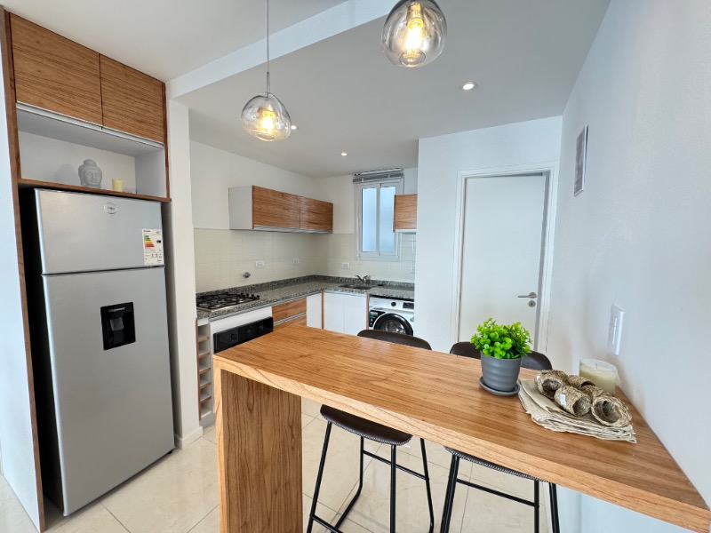 Cocina semi integrada con revestimientos en porcelanato, ventilación natural, amueblamientos a medida, barra desayunadora y conexión para lavarropas automático, cuenta con anafe, horno empotrado, lavarropas automatico y heladera con freezer