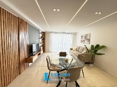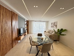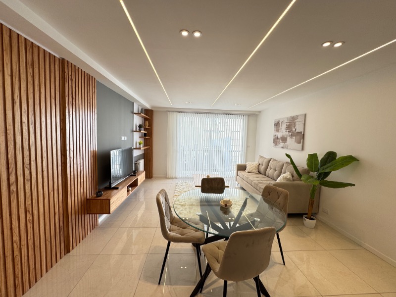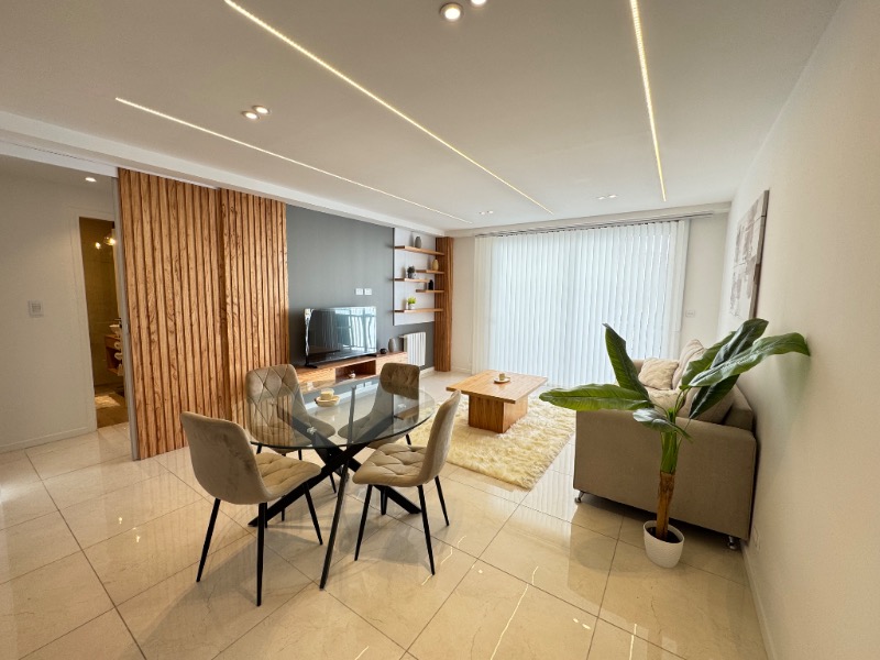 Living comedor amplio con piso de porcelanato y balcón saliente