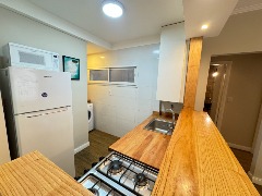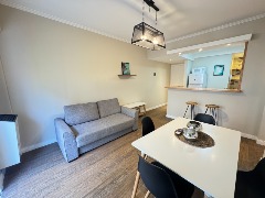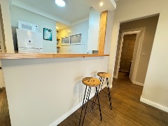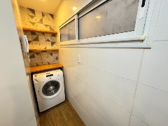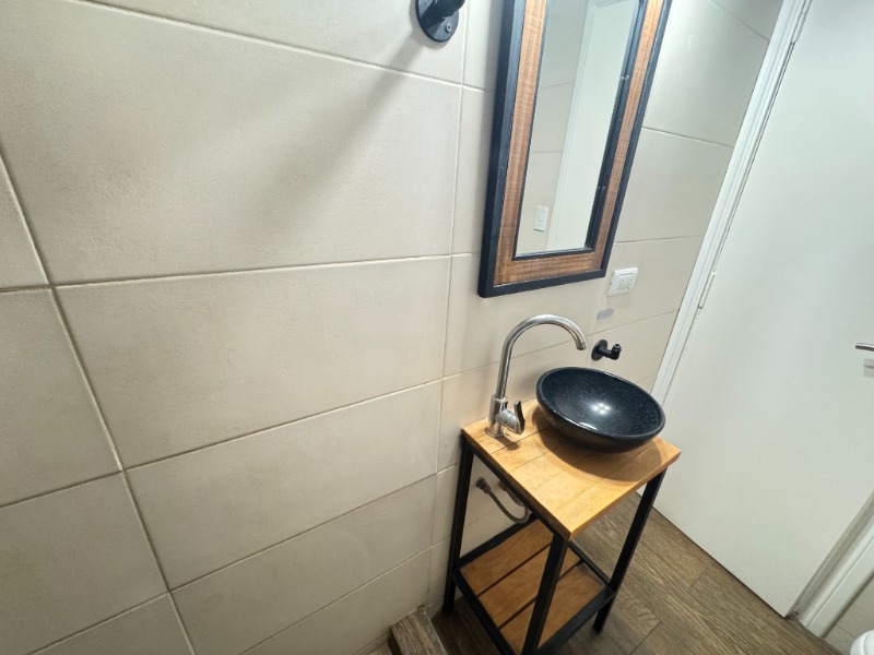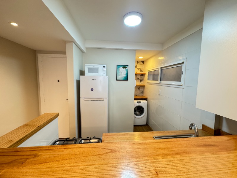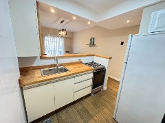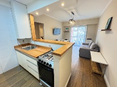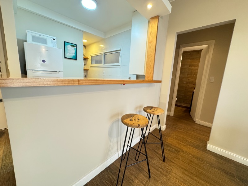 Cocina incorporada con revestimientos en cerámicos, ventilación natural, conexión para lavarropas automatico y barra desayunadora