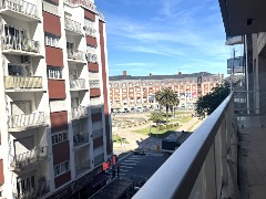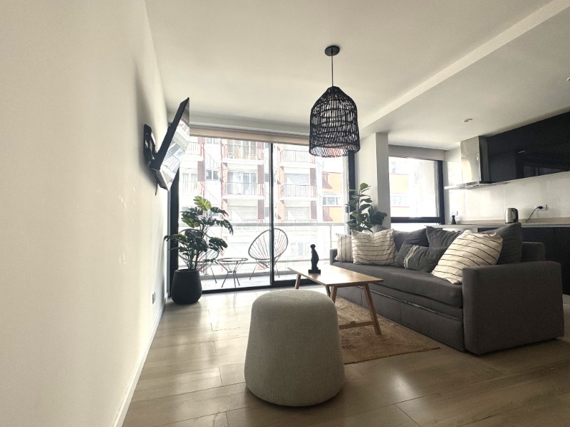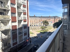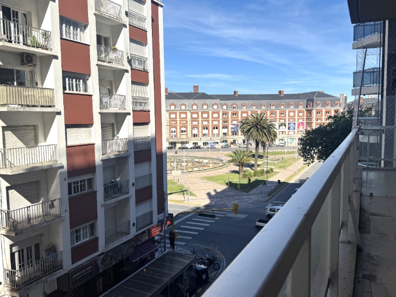 Living con piso porcelanato, con balcón saliente, vista lateral al casino y plaza Colón
