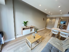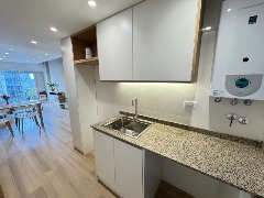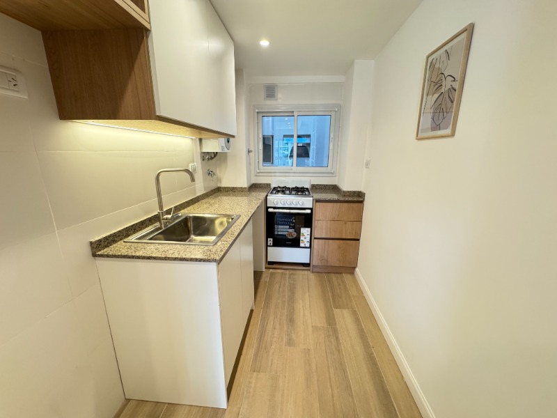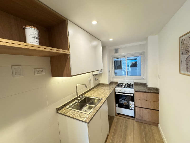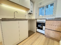 Cocina semi integrada con revestimientos en cerámicos, amueblamientos a medida, conexión para lavarropas automatico y ventilación natural.