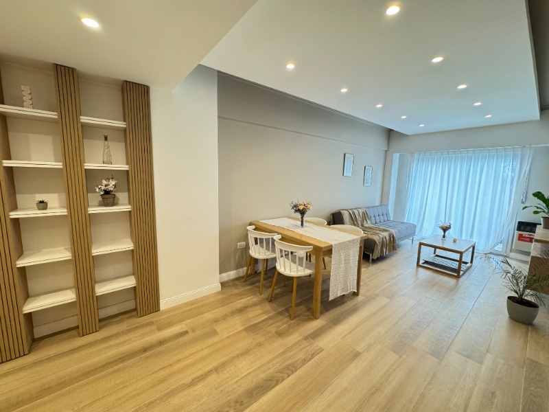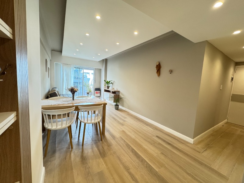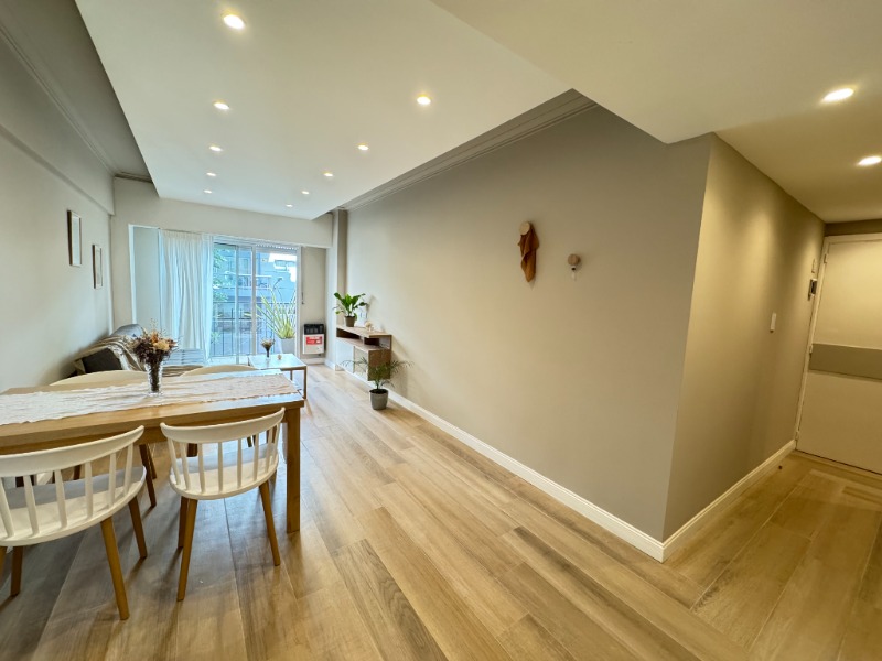 Living comedor con piso de porcelanato, calefactor tiro balanceado y balcón saliente