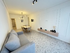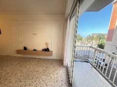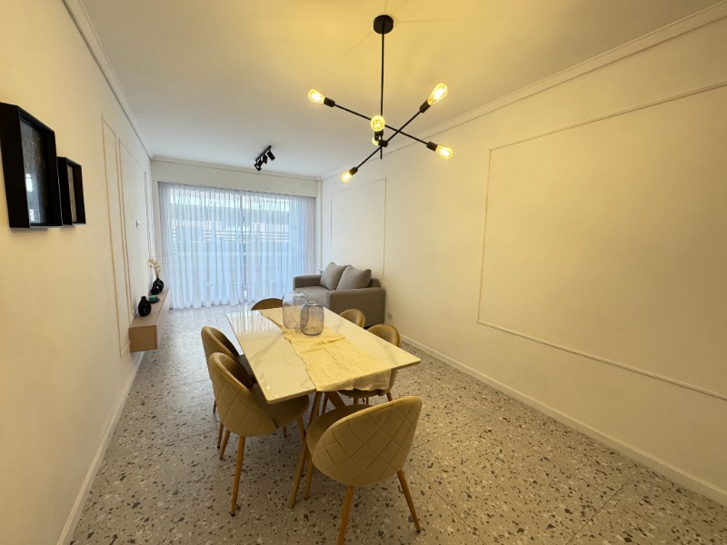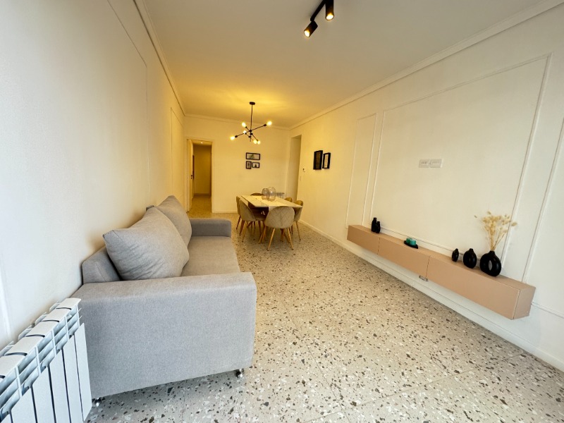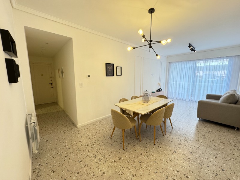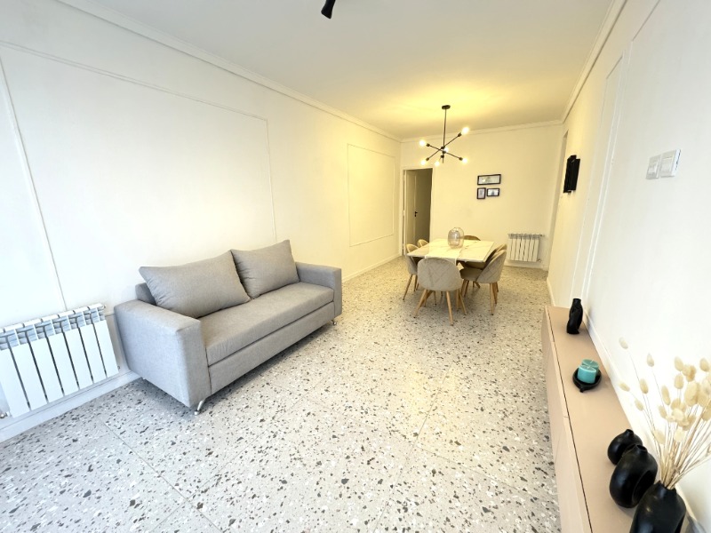 - Living comedor con piso de granito, calefacción por radiadores y balcón saliente con vista a la plaza colón