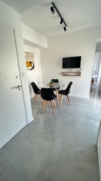 - Living comedor con piso de porcelanato, calefactor tiro balanceado y balcón terraza