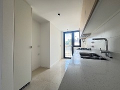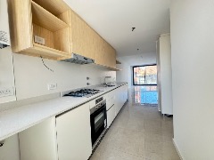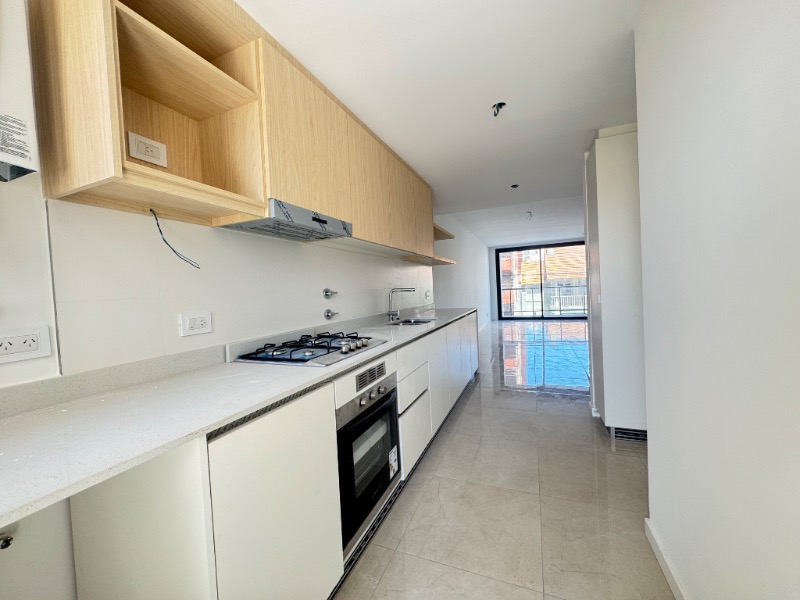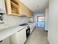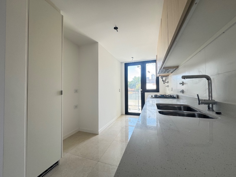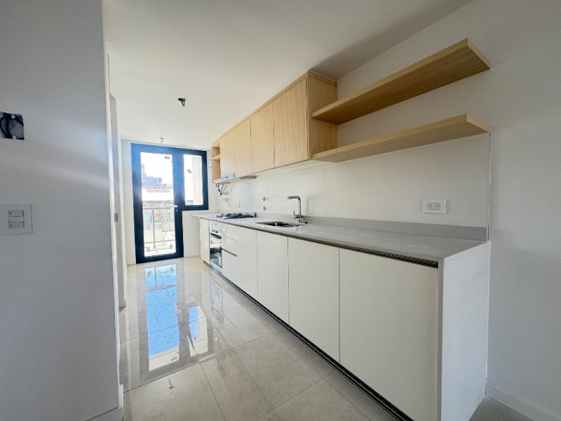 Cocina separada revestida en porcelanato, anafe, salida al balcón terraza.