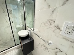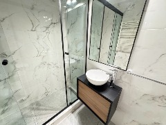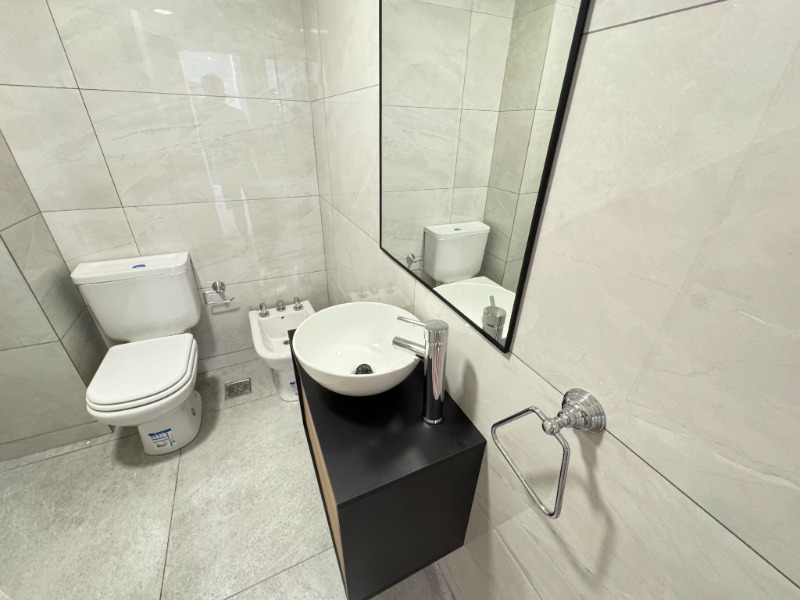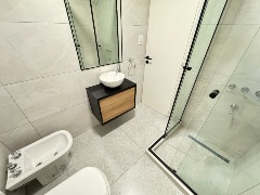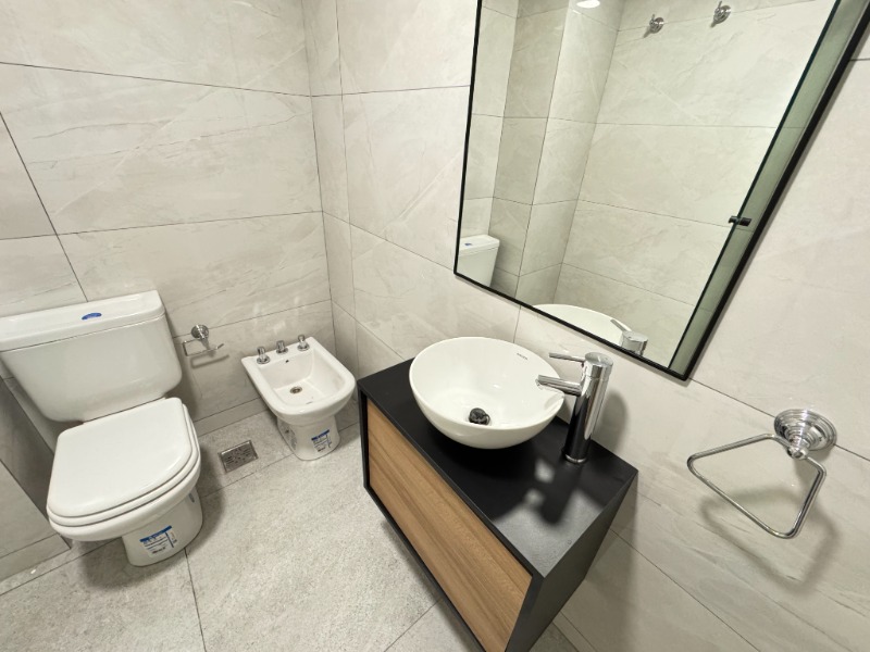 Dormitorio principal con piso de porcelanato con baño en suite y placard a medida