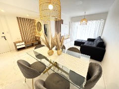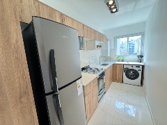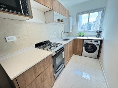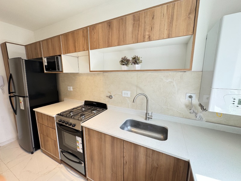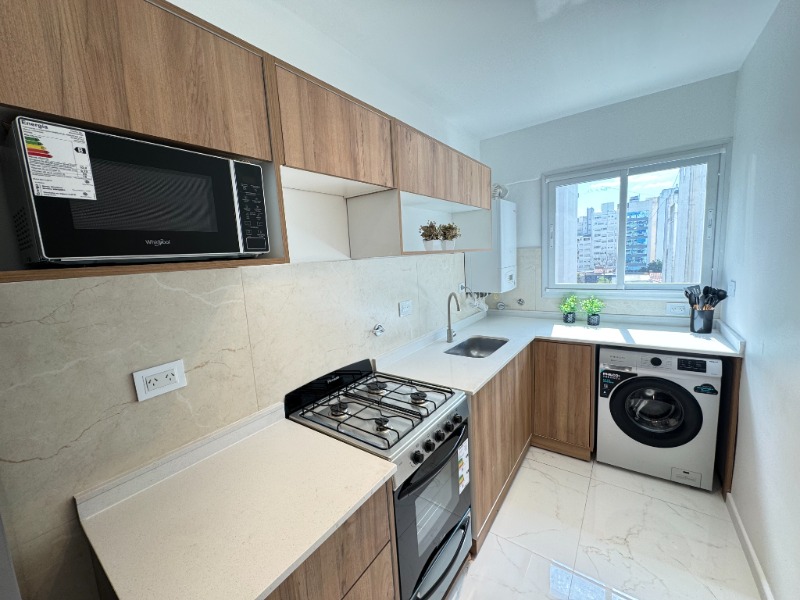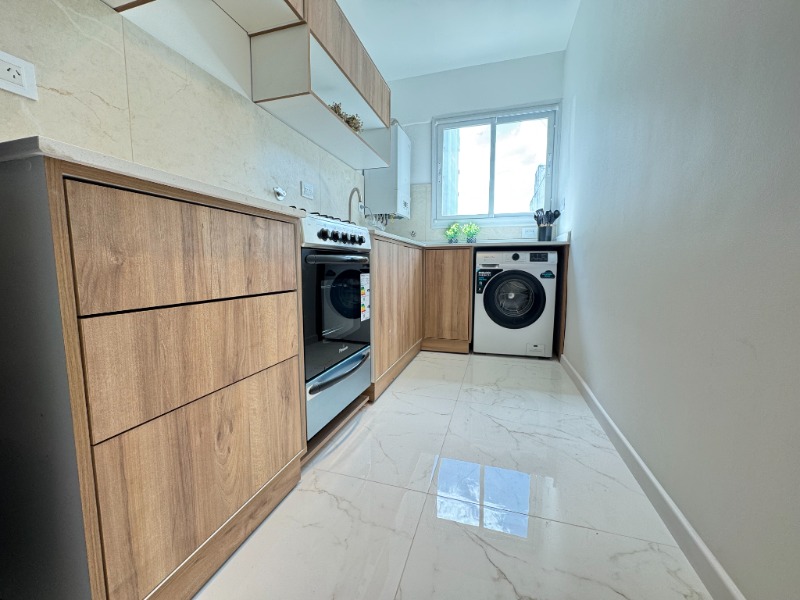 Cocina separada externa con revestimientos en porcelanato, amueblamientos a medida, conexión para lavarropas automatico y ventilación natural